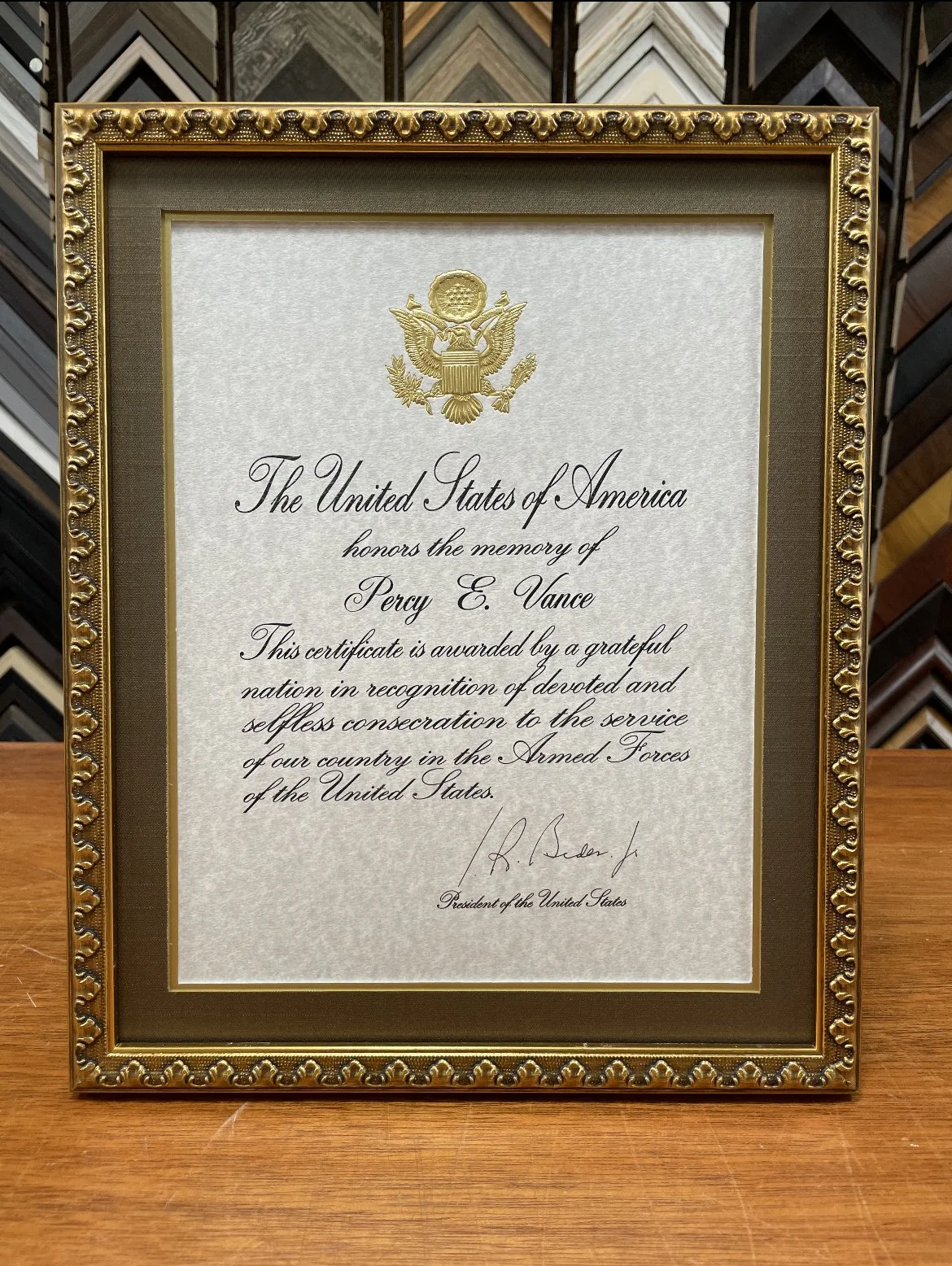 When we got this Certificate honoring Percy E. Vance for his service in the Armed Forces of the United States, signed by Joe Biden, President of the United States, we wanted to make it special.